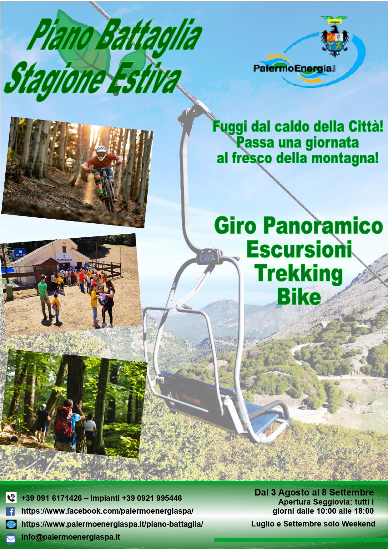 L’Amministratore Unico di Palermo Energia Antonio Tomaselli comunica che per tutto il mese di Agosto e fino all’8 Settembre la seggiovia sarà fruibile tutti i giorni della settimana dalle ore 10,00 alle ore 18,00 per consentire agli amanti della montagna di potersi godere delle splendide giornate immersi nella natura e lontani dall’afa di questo periodo!!!